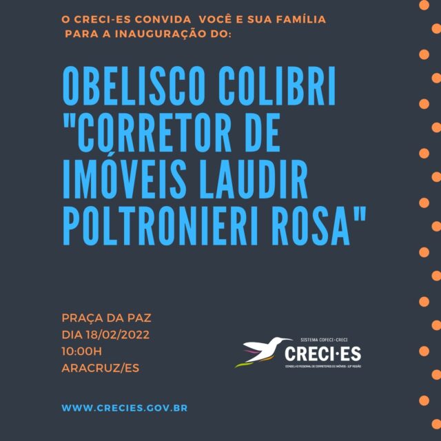 O CRECI-ES tem a honra de convidá-lo para participar da importantíssima realização para o Estado, o município de Aracruz e para a Categoria Profissional dos Corretores de Imóveis, que acontecerá no dia 18/02/22 às 10h na Praça na Praça da Paz, localizada em Aracruz. Quando será inaugurado o OBELISCO COLIBRI de Aracruz-ES, intitulado “Corretor de…