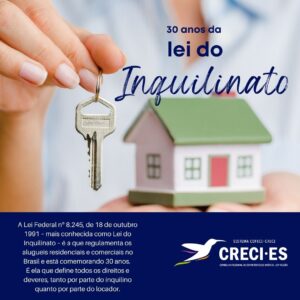 A Lei Federal nº 8.245, de 18 de outubro 1991 – mais conhecida como Lei do Inquilinato – é a que regulamenta os alugueis residenciais e comerciais no Brasil e está comemorando 30 anos. É ela que define todos os direitos e deveres, tanto por parte do inquilino quanto por parte do locador.