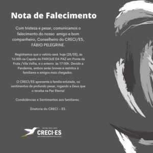 Com tristeza e pesar, comunicamos o falecimento do nosso amigo e bom companheiro, Conselheiro do CRECI/ES, FÁBIO PELEGRINE.