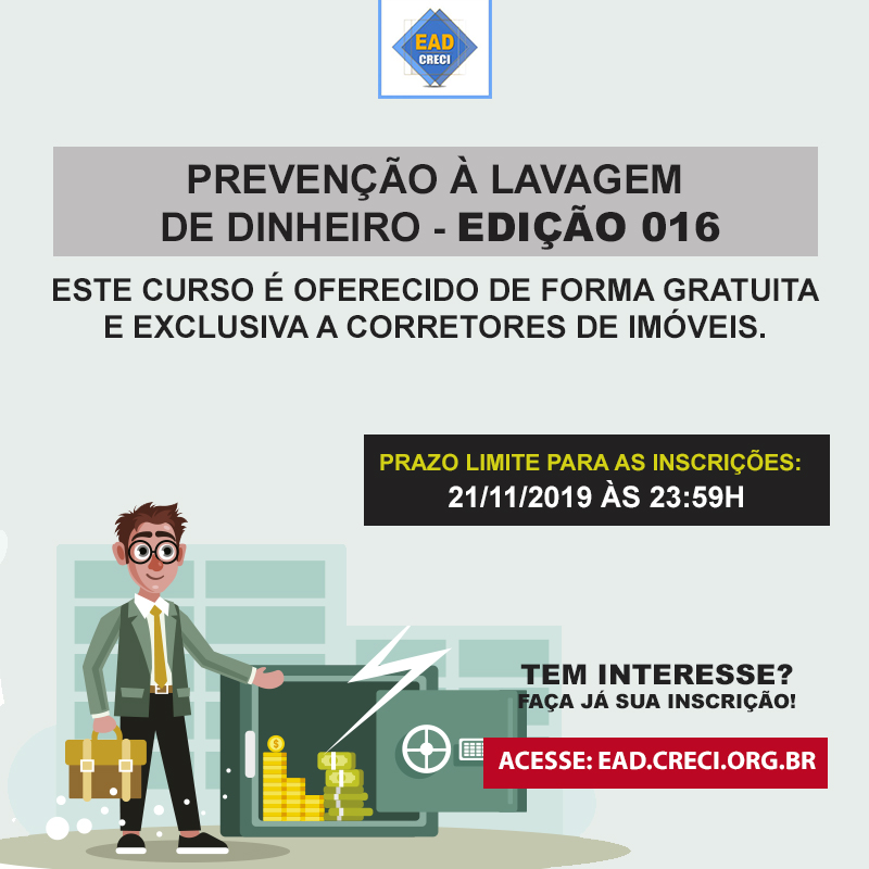 PREVENÇÃO À LAVAGEM DE DINHEIRO – Edição 016 Inicio das inscrições: 14/11/2019 às 00:00h. Prazo limite para as inscrições: 21/11/2019 às 23:59h. Início: 00:01h do dia 25/11/2019. |