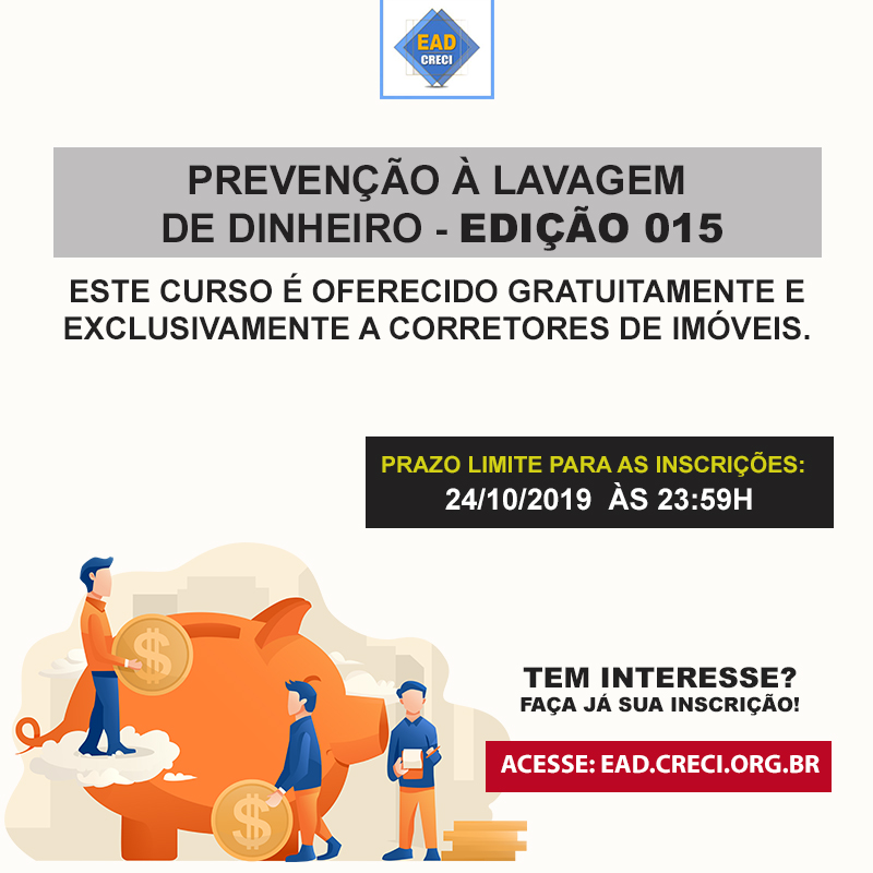 PREVENÇÃO À LAVAGEM DE DINHEIRO – Edição 015 Inicio das inscrições: 17/10/2019 às 00:00h. Prazo limite para as inscrições: 24/10/2019 às 23:59h. Início: 00:01h do dia 28/10/2019. |