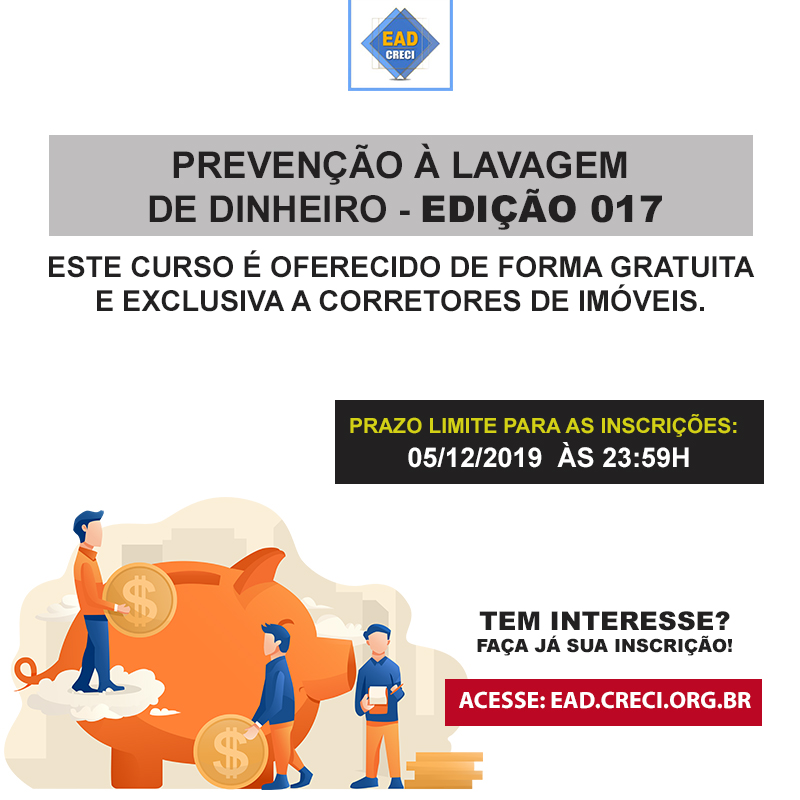PREVENÇÃO À LAVAGEM DE DINHEIRO – Edição 017 Início das inscrições: 28/11/2019 às 00:00h. Prazo limite para as inscrições: 05/12/2019 às 23:59h. Início: 00:01h do dia 09/12/2019. |