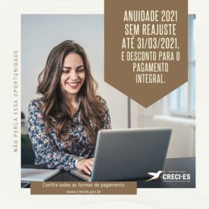 Fique atento: o corretor de imóveis que fizer o pagamento da anuidade até o dia 31 de janeiro/2021 terá um desconto de 10% no valor. Quem escolher pagar em 28 de fevereiro/2021 terá um desconto de 6% no valor da anuidade. E até o dia 31 de março, o desconto será de 4%.