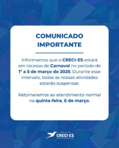 Informamos que o CRECI-ES estará em recesso de 1º a 5 de março de 2025. Durante esse período, nossas atividades estarão suspensas.