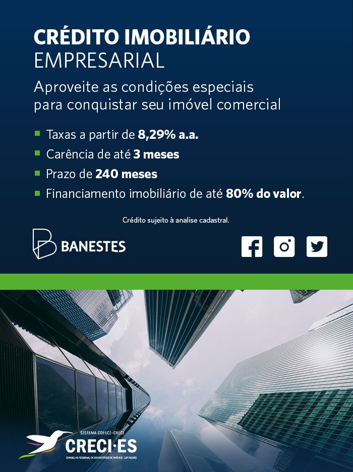 A nova linha de Crédito Imobiliário Empresarial e Comercial Banestes tem taxas a partir de 8,29% ao ano, com carência de até três meses para começar a pagar e prazo de 240 meses (20 anos). Poderá ser financiado até 80% do valor do imóvel.