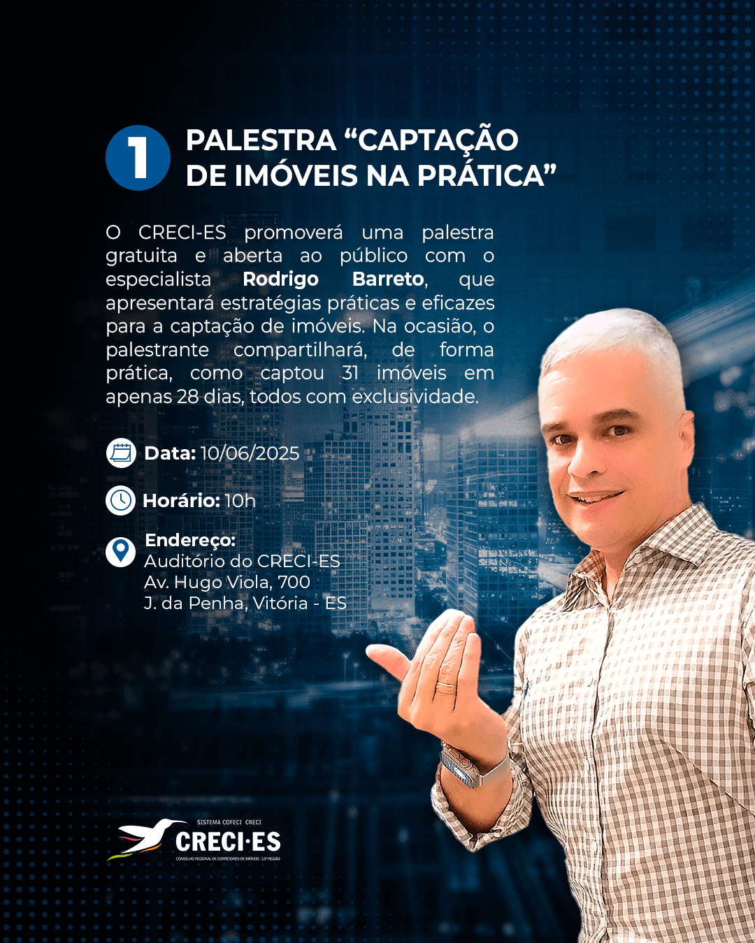 No dia 10 de junho, às 10 horas, será realizada a palestra “Captação de Imóveis na Prática”, com o especialista Rodrigo Barreto. O evento, que acontece no Auditório do CRECI-ES (Av. Hugo Viola, 700 J. da Penha, Vitória – ES) abordará estratégias e técnicas que resultaram na captação de 31 imóveis com exclusividade em apenas 28 dias.