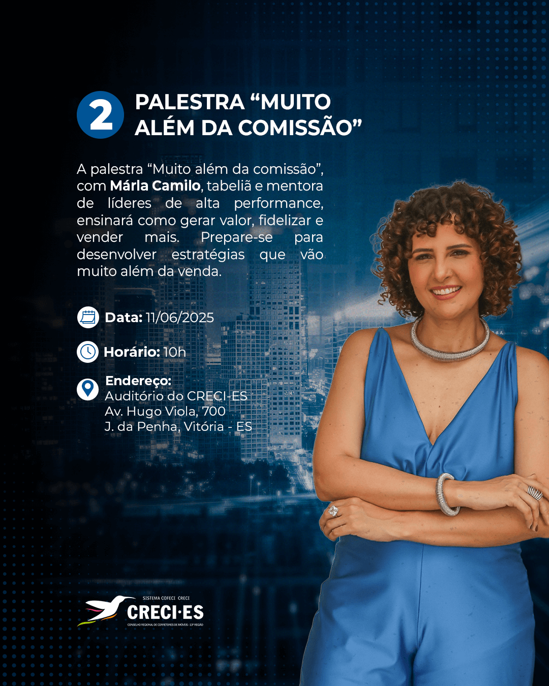 Já no dia 11 de junho, também às 10 horas, o mesmo espaço receberá a palestra “Muito Além da Comissão: como gerar valor, fidelizar e vender mais”, com Márla Camilo, tabeliã e mentora de líderes de alta performance. A proposta é apresentar ferramentas e estratégias que ajudam corretores a gerar valor, fortalecer o relacionamento com clientes e aumentar seus resultados.