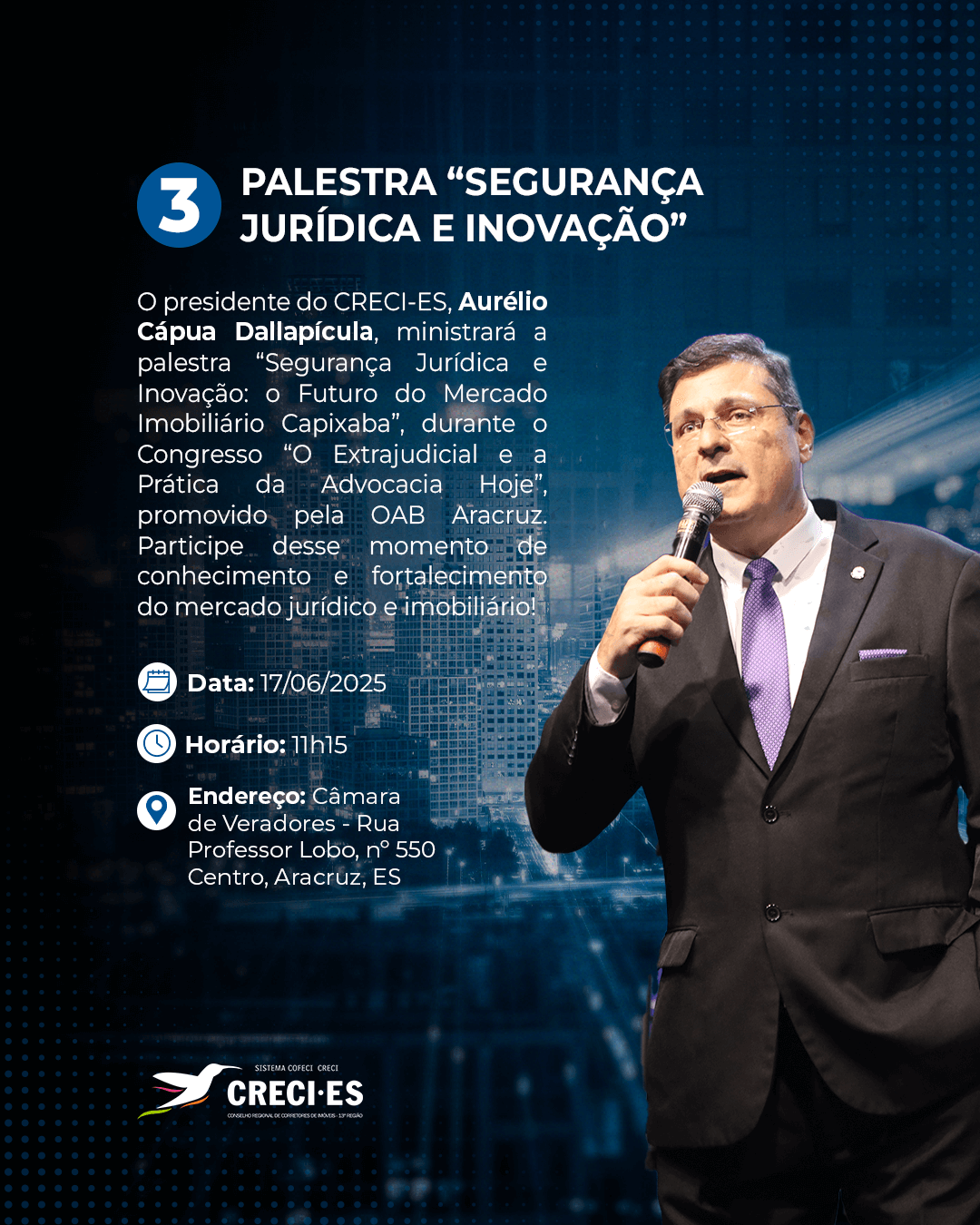 Encerrando a programação, no dia 17 de junho, às 11h15, o presidente do CRECI-ES, Aurélio Cápua Dallapícula, participará do Congresso “O Extrajudicial e a Prática da Advocacia Hoje”, promovido pela OAB Aracruz. Na ocasião, ministrará a palestra “Segurança Jurídica e Inovação: o Futuro do Mercado Imobiliário Capixaba”, que abordará temas essenciais sobre os desafios jurídicos e as tendências que impactam o setor. Este evento será realizado na Câmara de Vereadores de Aracruz (Rua Professor Lobo, nº 550 Centro, Aracruz, ES)