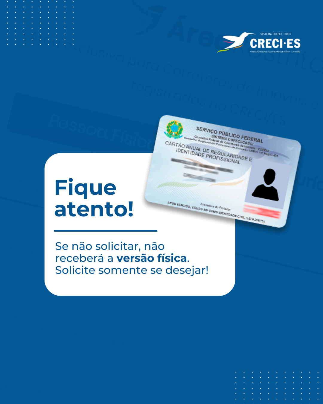 Você deve fazer a solicitação na área restrita do site oficial do CRECI. É importante destacar esta nova regra. Caso você não peça, não receberá a versão física da carteira. A emissão digital, porém, segue normalmente. Solicite a versão física apenas se realmente a desejar. Então, decida com calma.