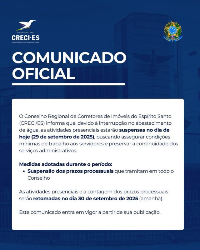 COMUNICADO OFICIAL O Conselho Regional de Corretores de Imóveis do CRECI Espírito Santo (CRECI/ES) informa que, devido à interrupção no abastecimento de água, as atividades presenciais estarão suspensas no dia de hoje (29 de setembro de 2025), buscando assegurar condições mínimas de trabalho aos servidores e preservar a continuidade dos serviços administrativos. Medidas adotadas durante…