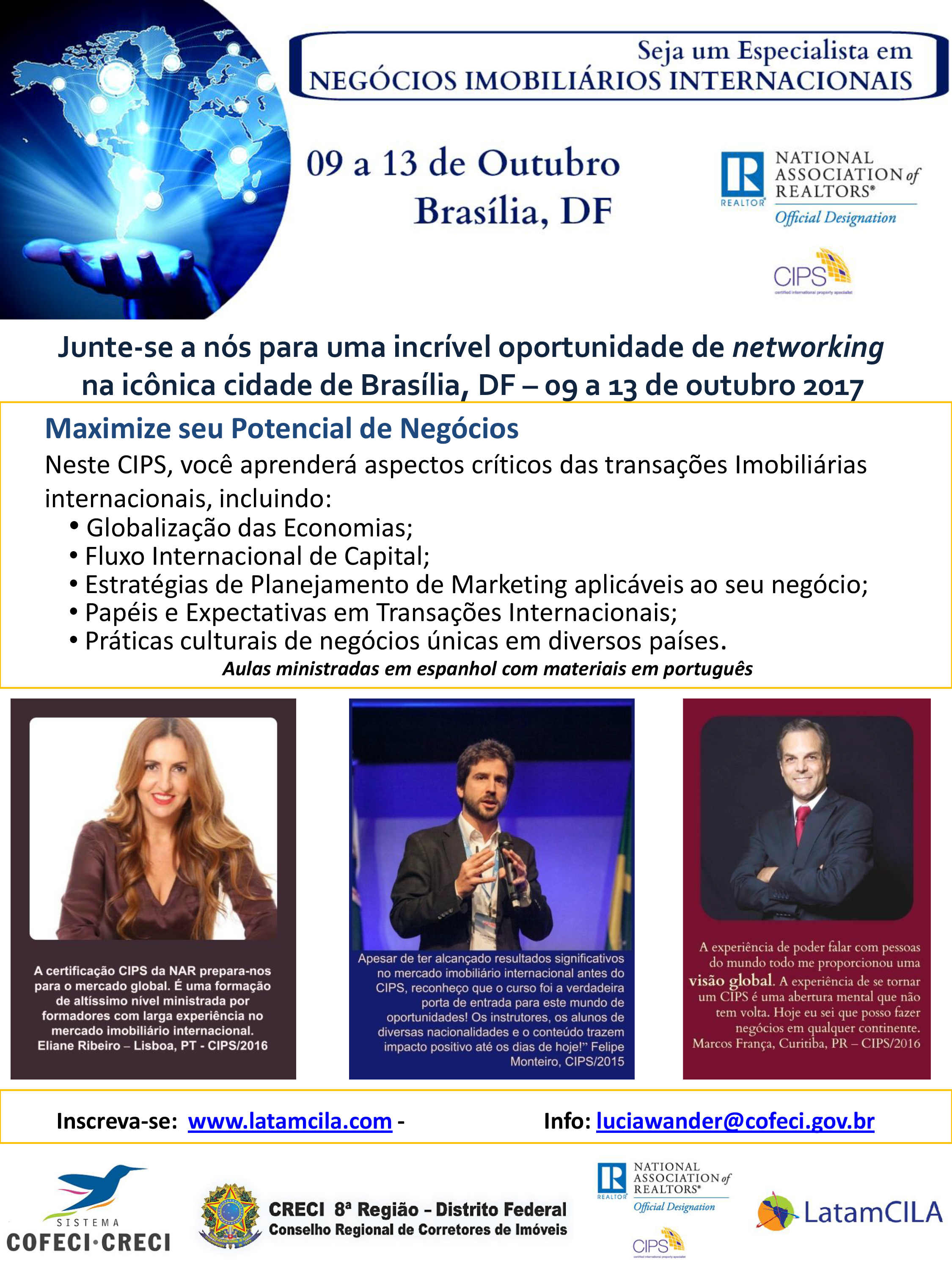 A principal certificação internacional do segmento imobiliário será realizada pela LatamCILA, com o apoio do Sistema COFECI-CRECI e do CRECI-DF. A Certificação CIPS é bastante desejada pelos profissionais do mercado imobiliário internacional. Como um profissional designado CIPS, o corretor fará parte de uma rede de mais de 2.500 profissionais do mercado imobiliário. Estes parceiros de referência, corretores altamente preparados e conectados, com formação especializada em transações internacionais poderão ajudá-lo a fazer negócios em mais de 60 países.