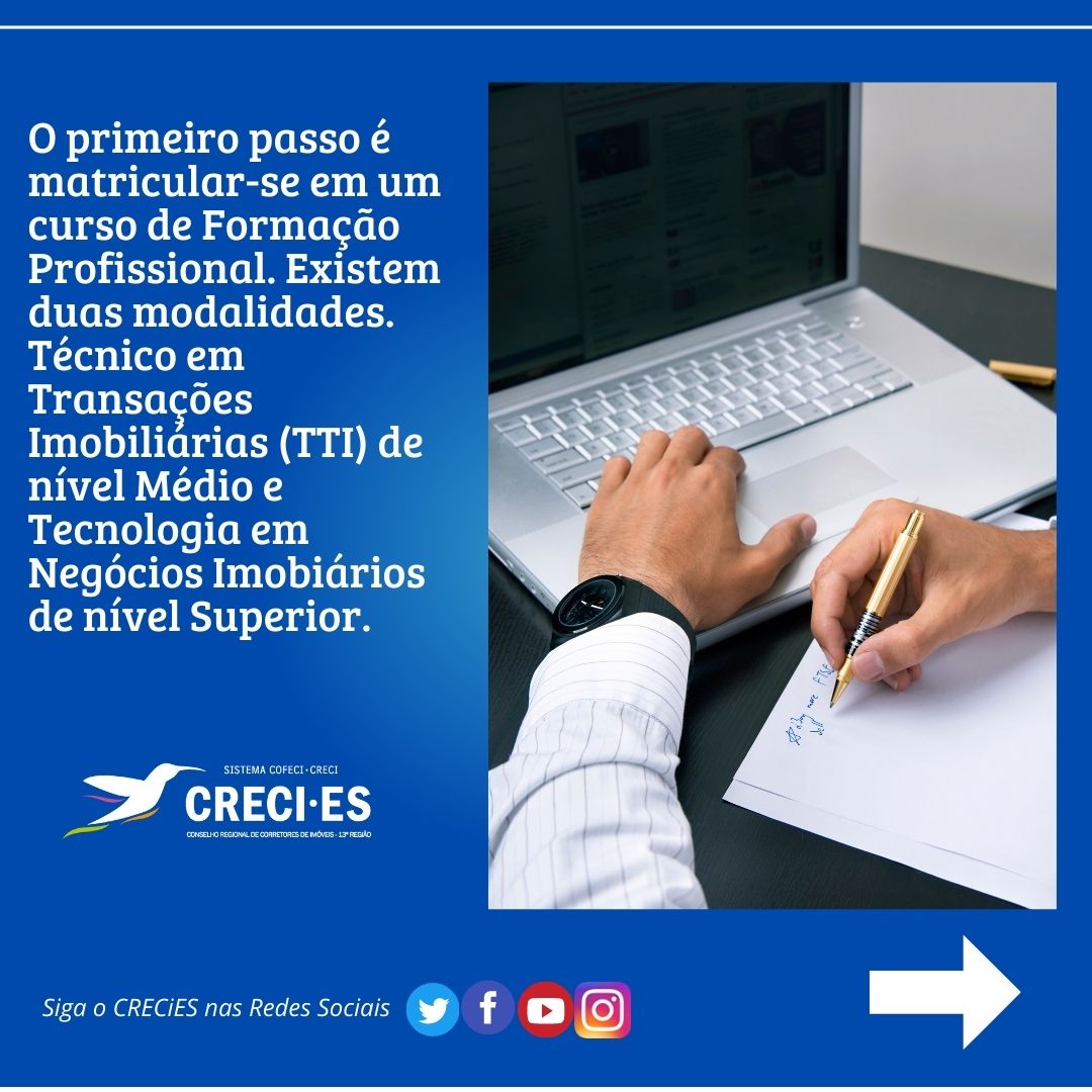Tendo concluído o curso de formação, cumprido um mínimo de 128 horas de estágio supervisionado e diplomado, o agora Técnico em Transações Imobiliárias ainda não é corretor de imóveis. Para alcançar esta condição, deverá ir ao CRECI, municiado de uma série de documentos solicitados, recolher as taxas necessárias e solicitar sua carteira com respectivo número de inscrição profissional.