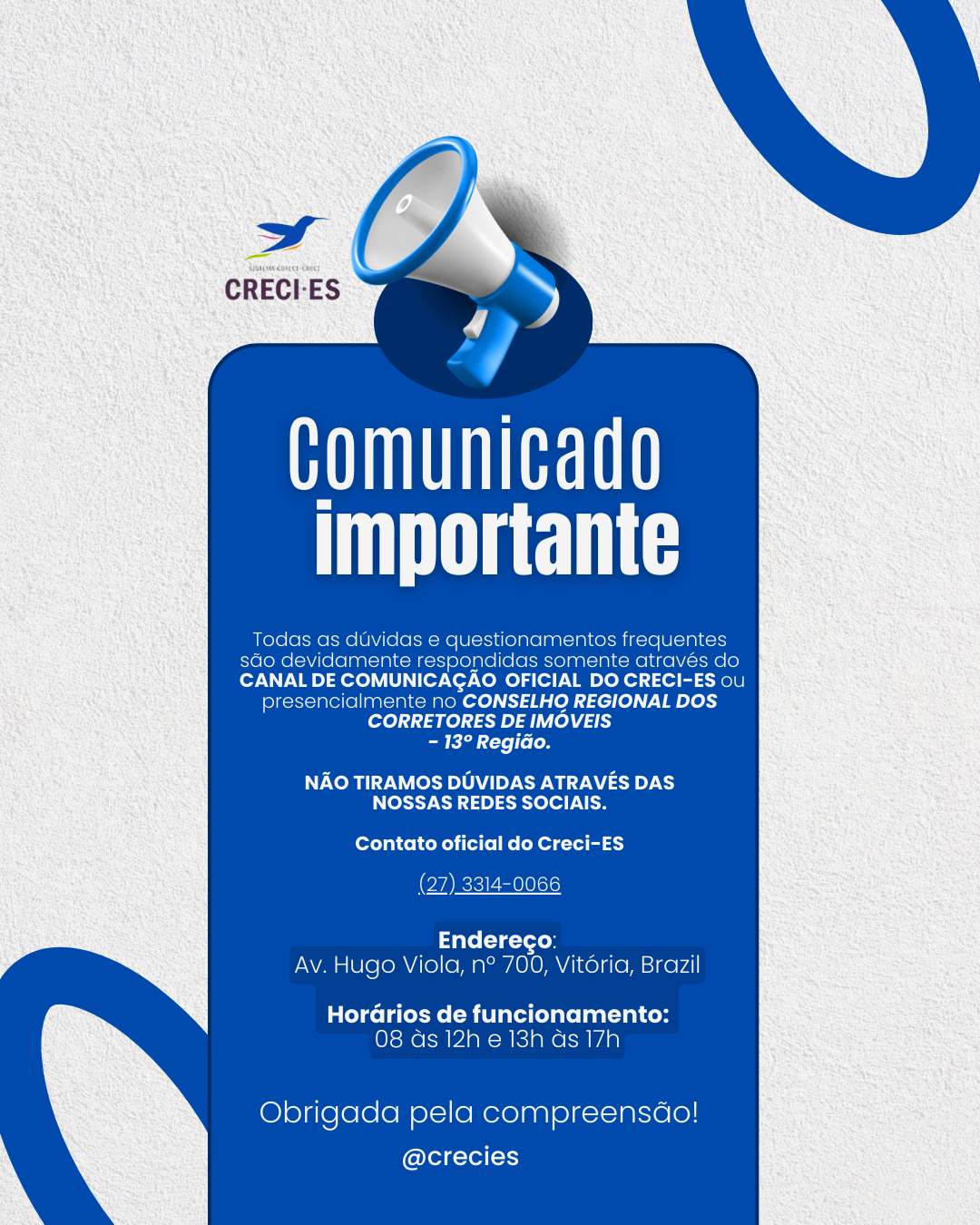 Todas as dúvidas e questionamentos frequentes são devidamente respondidas SOMENTE através do CANAL DE COMUNICAÇÃO OFICIAL DO CRECI-ES ou presencialmente no CONSELHO REGIONAL DOS CORRETORES DE IMÓVEIS- 13° Região.