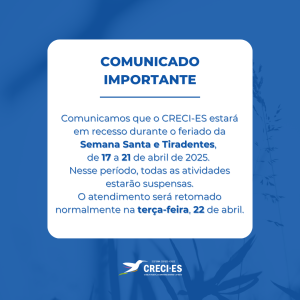 O Conselho Regional de Corretores de Imóveis da 13ª Região (CRECI-ES) informa que estará em recesso no período de 17 a 21 de abril de 2025, em virtude do feriado da Semana Santa e do Dia de Tiradentes.