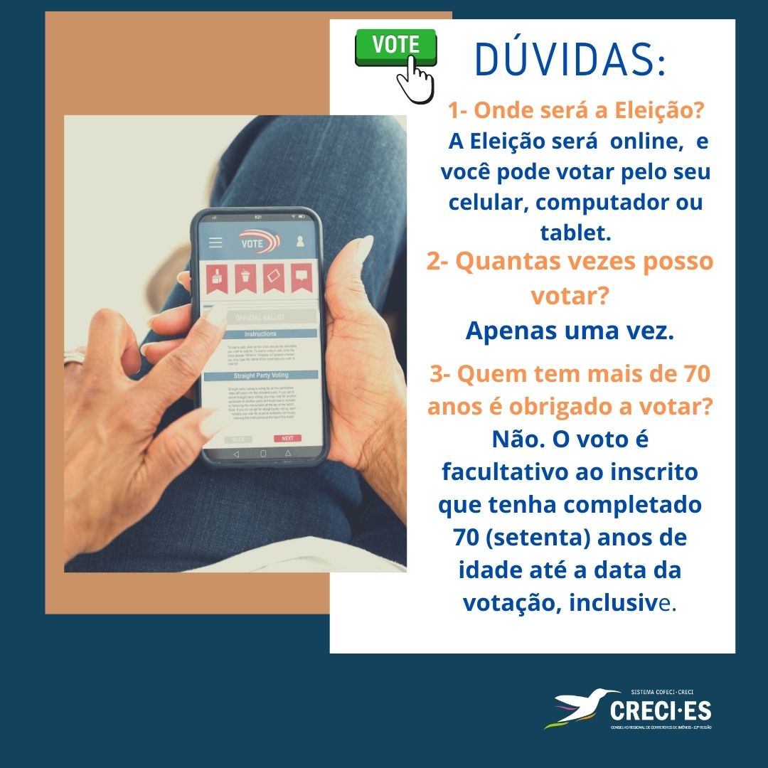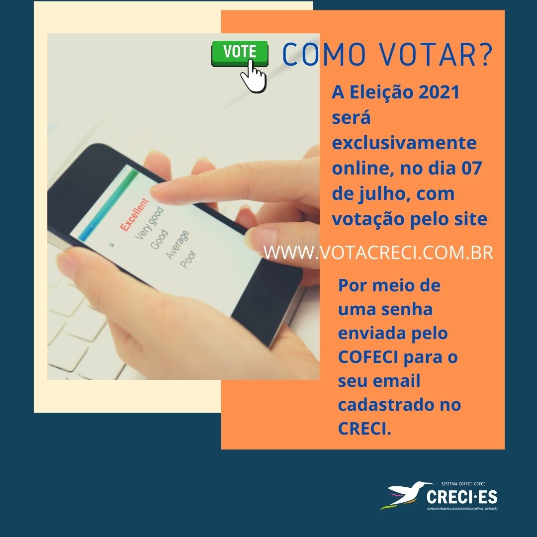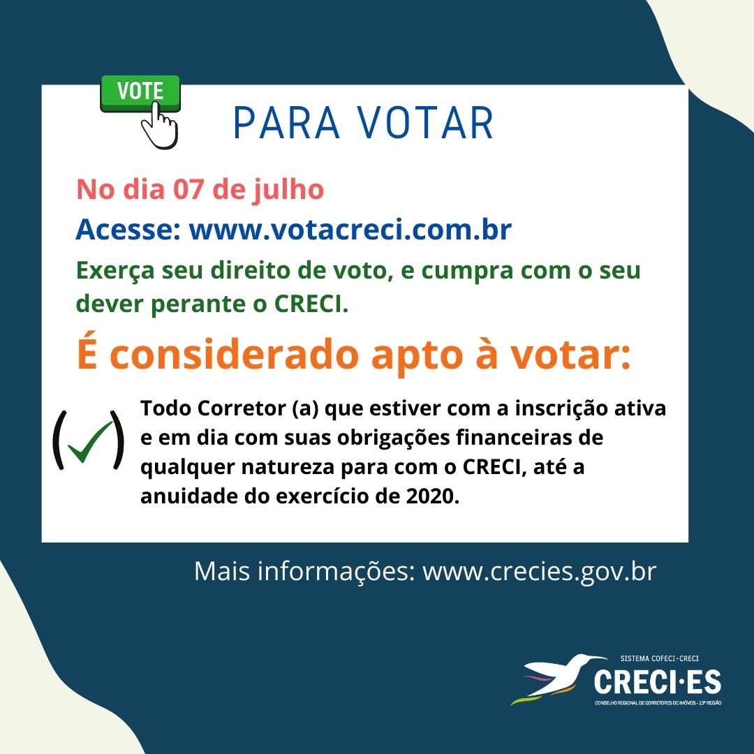 A eleição ocorrerá exclusivamente pela internet POR MEIO do site www.votacreci.com.br que poderá ser acessado no dia da eleição das 00h00 às 20h00.