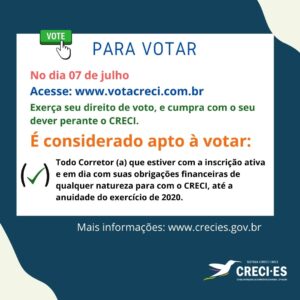 No dia 7 de julho de 2021, haverá eleição em todos os Conselhos Regionais de Corretores de Imóveis integrantes do Sistema COFECI-CRECI para escolha dos vinte e sete Conselheiros efetivos e igual número de suplentes, que serão eleitos para comporem os Conselhos Plenos dos CRECI’s durante o triênio 2022/2024.