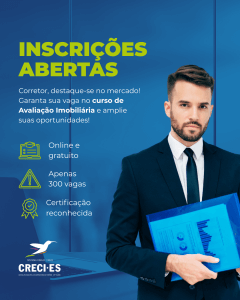 O Conselho Regional de Corretores de Imóveis do Espírito Santo (CRECI-ES) tem uma grande novidade. Abrimos as inscrições para o curso de Avaliação Imobiliária. Oferecemos este curso de forma totalmente online, e também é gratuito. Esta capacitação destina-se exclusivamente a corretores de imóveis. Acima de tudo aos que desejam se destacar no mercado e ampliar suas oportunidades profissionais.
