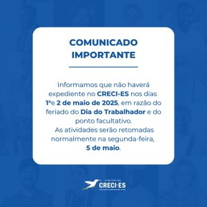 O Conselho Regional de Corretores de Imóveis do Espírito Santo (CRECI-ES) informa que não haverá expediente nas próximas quinta e sexta-feira, dias 1º e 2 de maio de 2025, em razão do feriado nacional do Dia do Trabalhador e do ponto facultativo decretado na data seguinte.