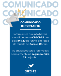 O Conselho Regional de Corretores de Imóveis do Espírito Santo ( CRECI-ES ) informa que não haverá expediente nos dias 19 e 20 de junho, quinta e sexta-feira, em virtude do feriado de Corpus Christi .