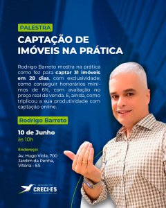 O Conselho Regional de Corretores de Imóveis da 13ª Região/ES promoverá, no dia 10 de junho, às 10h, uma palestra gratuita e aberta ao público com o especialista Rodrigo Barreto, que apresentará estratégias práticas e eficazes para a captação de imóveis.