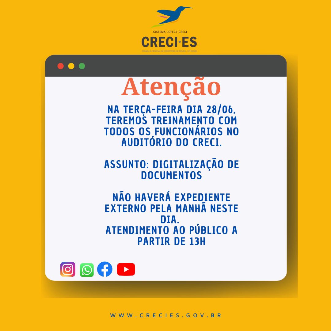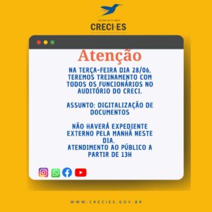 Informamos que na próxima terça-feira (28/06), não teremos expediente externo no CRECI durante o período da manhã.