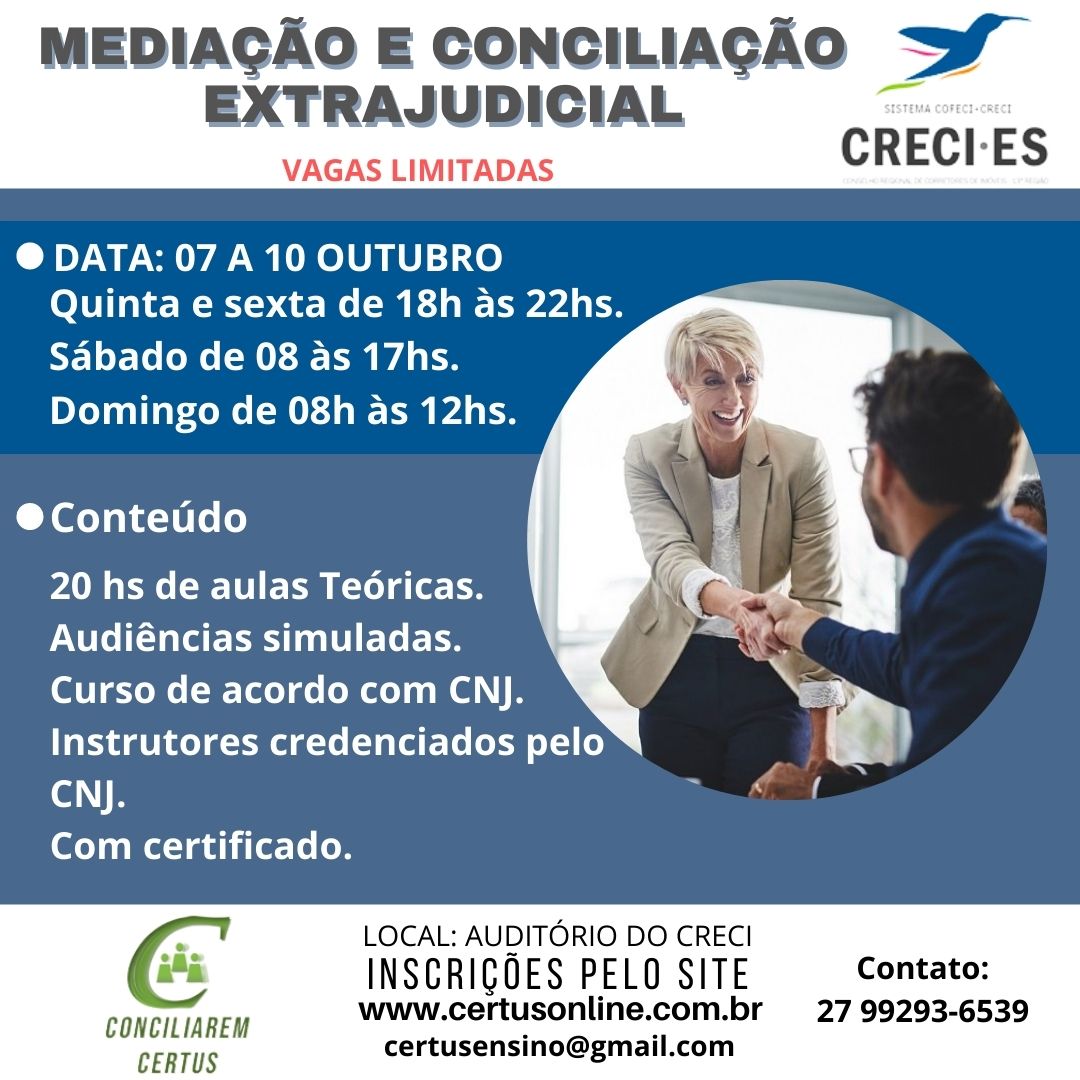 CURSO DE CAPACITAÇÃO EM MEDIAÇÃO E CONCILIAÇÃO EXTRAJUDICIAL (permite atuar como mediador/conciliador fora das audiências dos CEJUSCs – Centros Judiciais de Solução de Conflitos e Cidadania do Poder Judiciário)