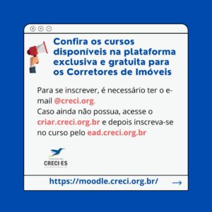 dia 19 de julho (segunda-feira), você pode se inscrever na plataforma exclusiva e gratuita para os Corretores que está no site do CRECI-ES.