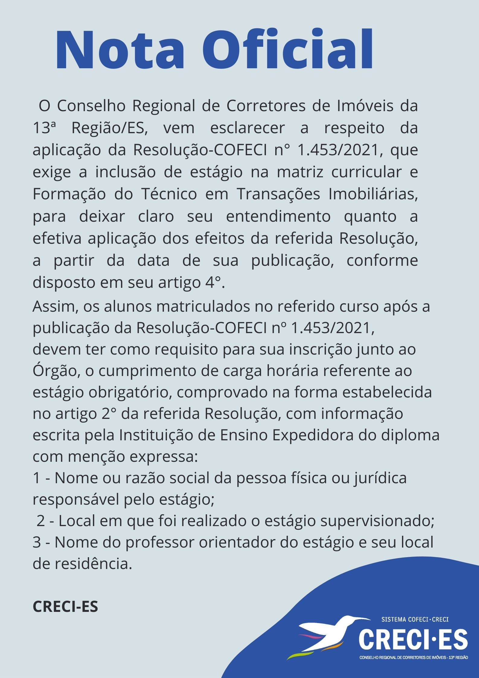 👉🏽Passa a valer a Resolução COFECI n 1.453/2021 que exige a inclusão do Estágio Obrigatório para o recebimento de diplomas do curso de Técnico em Transações Imobiliárias (TTI).