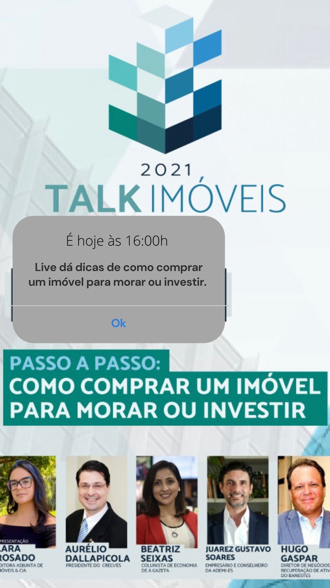 Se você quer sair do aluguel mas, não tem ideia de como comprar um imóvel, se tem vontade de investir no mercado imobiliário, mas tem dúvidas de onde buscar informações, hoje às 16:00 horas, especialistas da área vão dar dicas importantes e responder algumas perguntas na Segunda Live do Projeto Talk Imóveis, no site da Rede Gazeta (https://www.agazeta.com.br/imoveis). O encontro será online e terá a presença de autoridades no assunto que vão levar conhecimento e informações sobre o Mercado. São eles: Empresário e Conselheiro da Associação das Empresas do Mercado Imobiliário do Estado do ES (ADEMI/ES) Juarez Gustavo Soares, Presidente do Conselho Regional de Corretores de Imóveis do Espírito Santo (CRECI-ES) Aurélio Cápua Dallapícula, a Jornalista e Colunista do Jornal A Gazeta Beatriz Seixas, e o Diretor de Negócios e Recuperação de Ativos do BANESTES Hugo Gaspar.