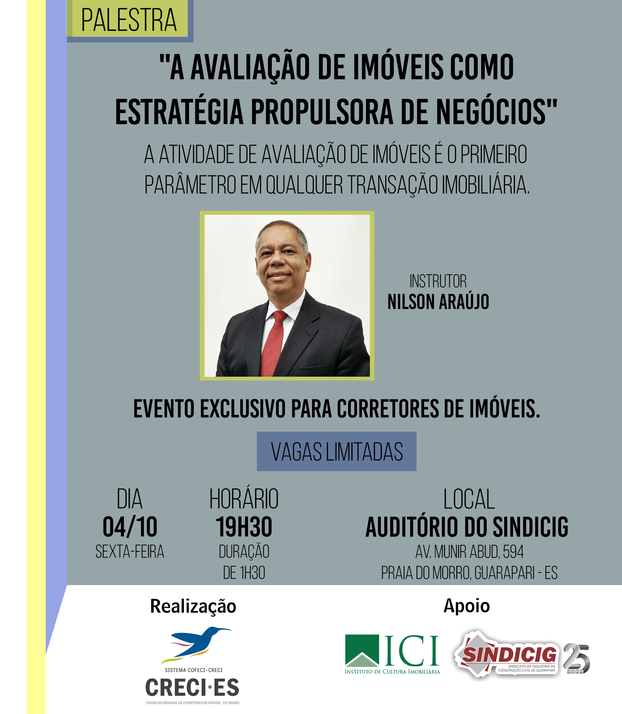 PALESTRA EM GUARAPARI EXCLUSIVA PARA CORRETORES DE IMÓVEIS TEMA: “A Avaliação de Imóveis como estratégia propulsora de Negócios” A palestra será ministrada pelo Dr. Nilson Araújo, sabendo que a Avaliação de Imóveis é o primeiro parâmetro em qualquer transação imobiliária. O profissional precisa estar capacitado para atuar nesta atividade lucrativa e crescente no mercado imobiliário.…