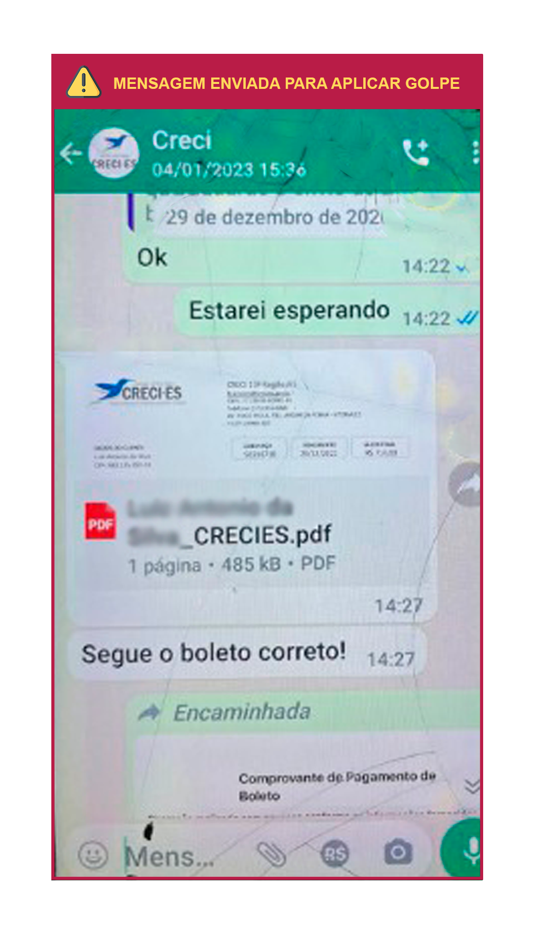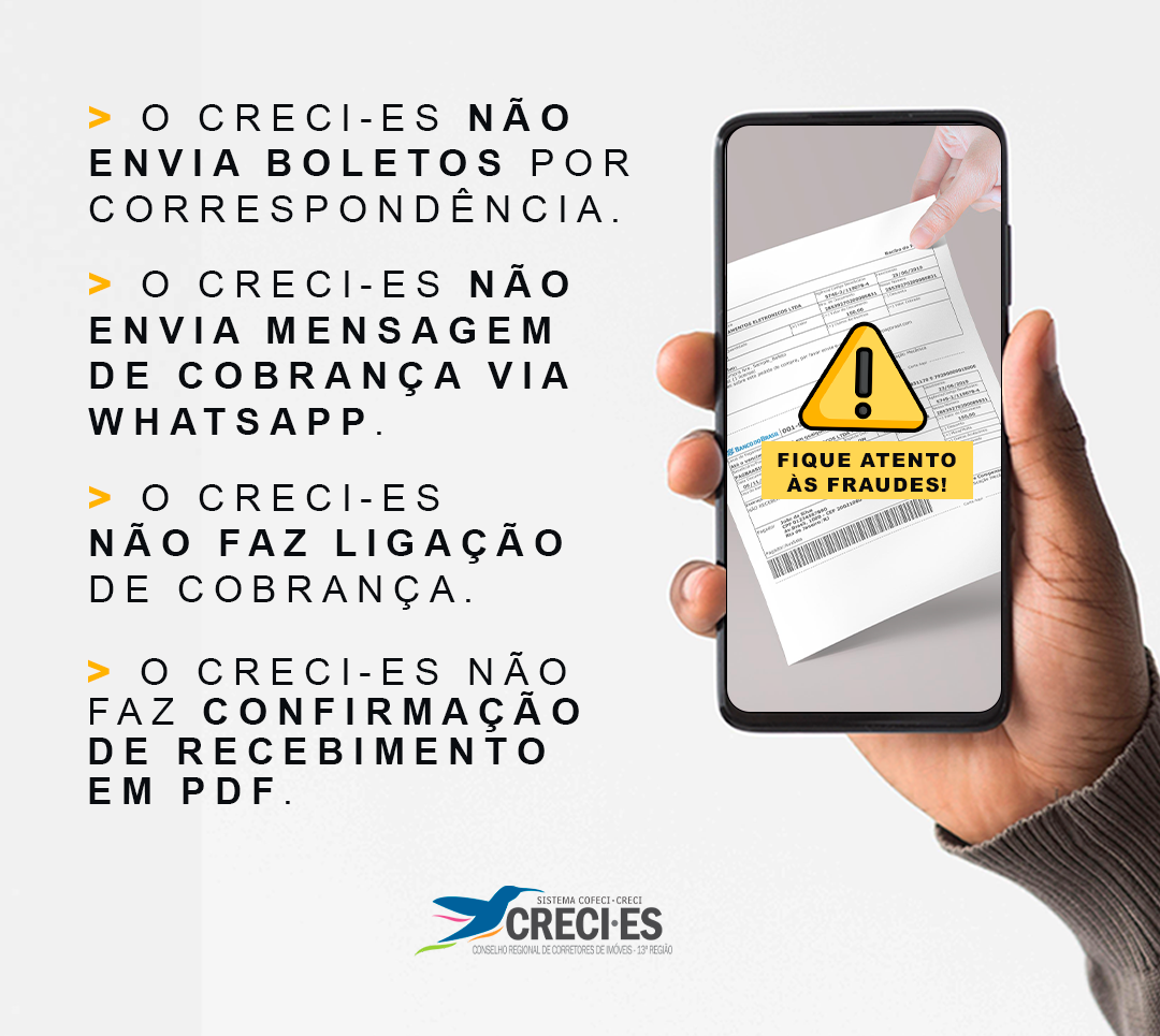 Por isso, quando receber algum boleto, ligação ou mensagem via WhatsApp fique atento às informações, datas e valores relacionados ao CRECI-ES.