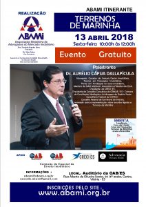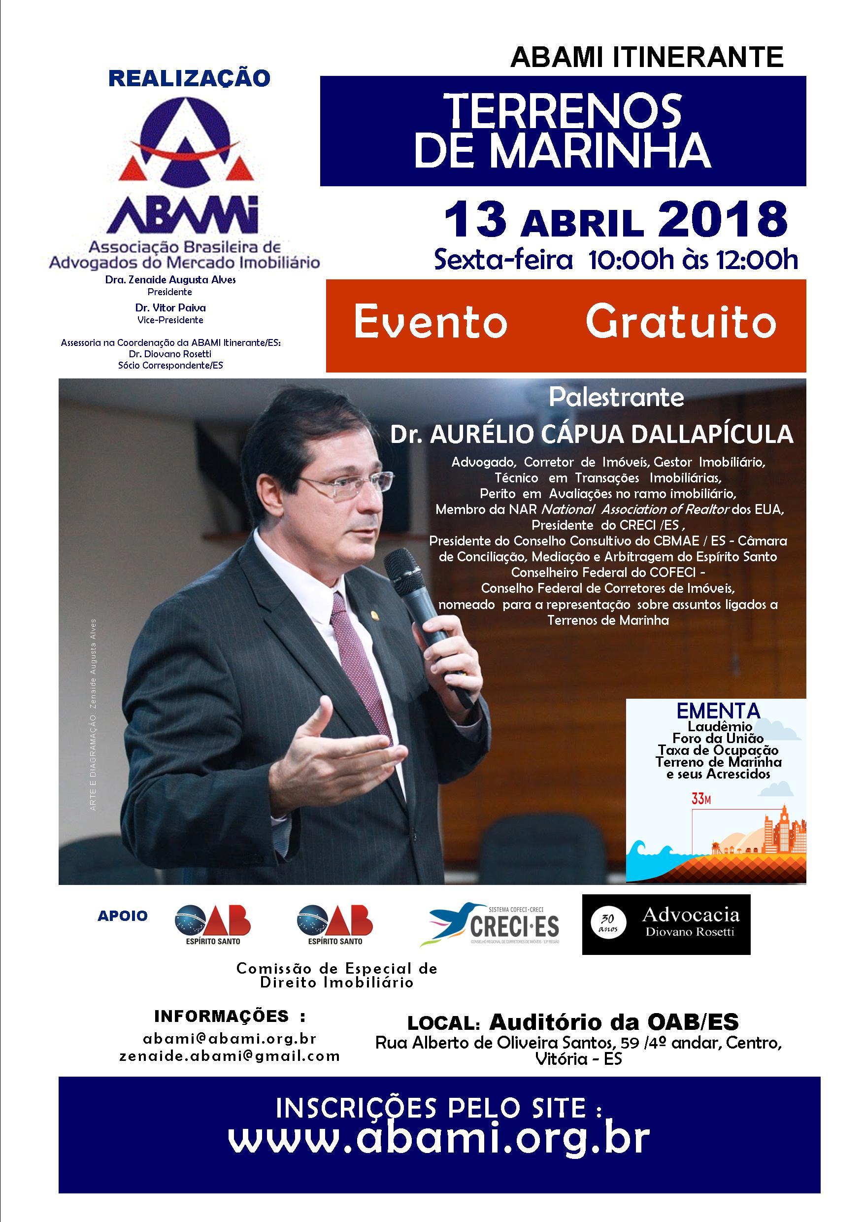 Aurélio Cápua Dallapícula, Presidente eleito do CRECI/ES, é o palestrante convidado para o evento gratuito, organizado pela ABAMI – Associação Brasileira de Advogados do Mercado Imobiliário. Acontece no dia 13 de abril, de 10:00 horas as 12:00 horas, no auditório da OAB/ES. Os interessados deverão garantir suas inscrições no Site da ABAMI: https://goo.gl/3c2wXf