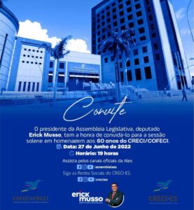 A Assembleia Legislativa realiza Sessão Solene em homenagem aos 60 anos Sistema CRECI-COFECI. A solenidade será nesta segunda-feira (27), às 19h, e atende ao requerimento do Presidente da Casa, Deputado Estadual Erick Musso.