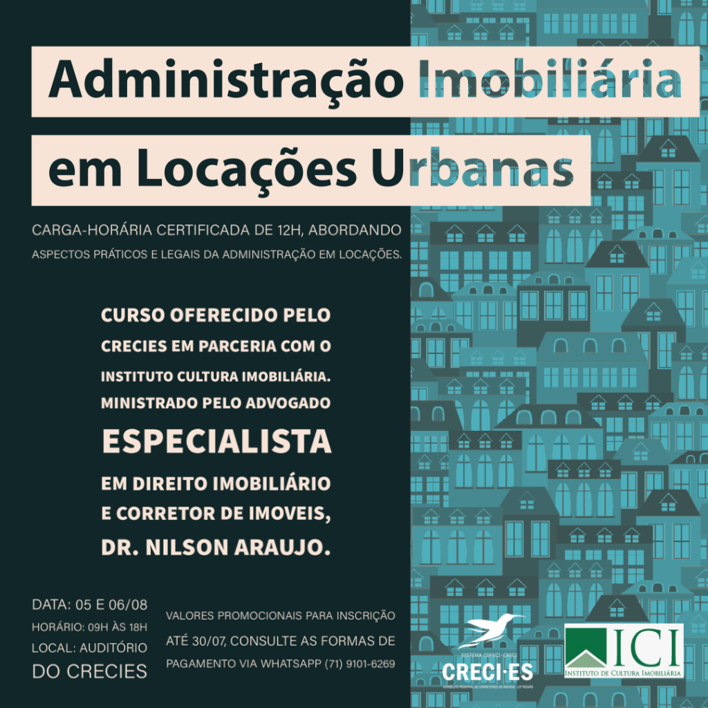 1 – ADMINISTRAÇÃO IMOBILIÁRIA EM LOCAÇÕES URBANAS, dias 05 e 06/08 – O Curso visa instruir o profissional da intermediação imobiliária quanto aos aspectos legais e práticos que envolvem a locação de imóveis, no tocante às locações urbanas. Serão dois dias de aprendizado com carga-horária certificada de 12h, as aulas terão duração de 09h as 18h com intervalos para almoço e coffee break. Durante as aulas será possível fazer perguntas e interagir com os demais colegas, podendo gozar dos benefícios da network e compartilhamento de experiências.