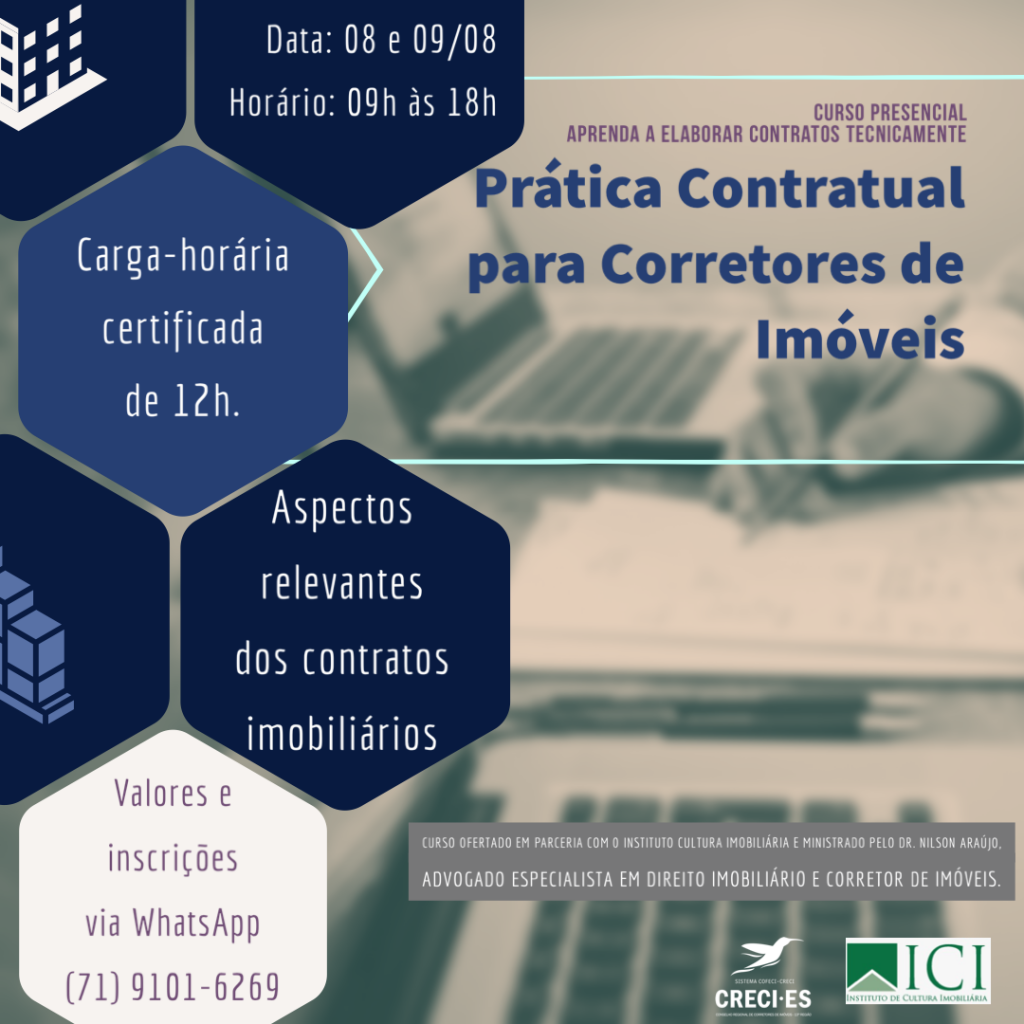 3 – PRÁTICA CONTRATUAL PARA CORRETORES DE IMÓVEIS, dias 08 e 09/08 – O Curso aborda a necessidade de conhecimento das regras e dos tipos de contratos em transações imobiliárias, viabilizando a realização de negócios com segurança. Além de cláusulas contratuais serão tratados os aspectos geais dos contratos e o importante apontamento para a garantia de recebimento de honorários, seja pela intermediação na venda, locação ou administração de imóveis. Durante as aulas será possível fazer perguntas e interagir com os demais colegas, podendo gozar dos benefícios da network e compartilhamento de experiências. As aulas serão no horário de 9h as 18h, nos dois dias.