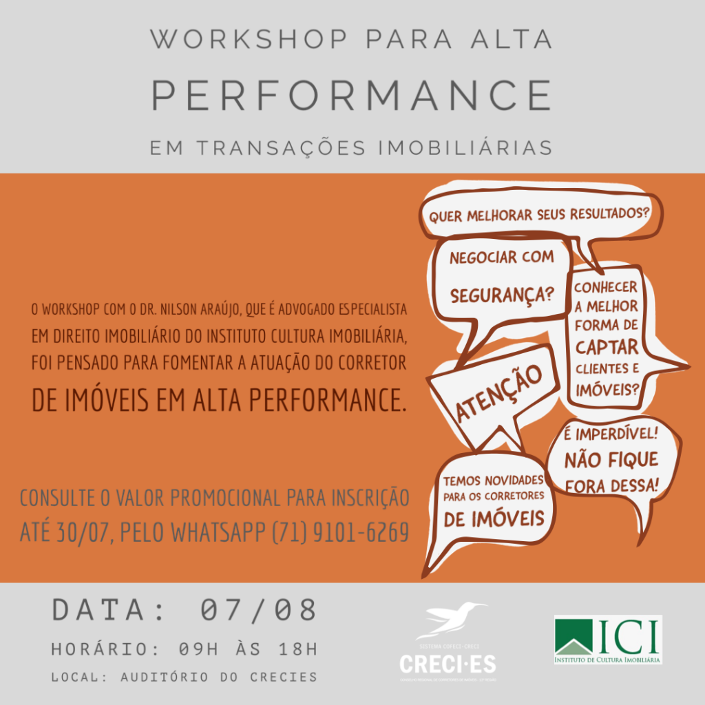 2 – WORKSHOP PARA ALTA PERFORMANCE EM TRANSAÇÕES IMOBILIÁRIAS, dia 07/08 – O workshop foi pensando para fomentar a atuação dos Corretores de Imóveis, para alcançar melhores resultados profissionais, conferindo mais ética e segurança aos seus negócios. Acontecerá de 9h às 18h e durante a explanação dos temas será tratada a realidade do Corretor de Imóveis com aplicação de técnicas para encarar os desafios tecnológicos, pessoais e legais que envolvem a intermediação em transações imobiliárias. Isso tudo com a experiência do Dr. Nilson Araújo, que é Advogado Especialista em Direito imobiliário e Corretor de Imóveis, atuante há 42 anos.